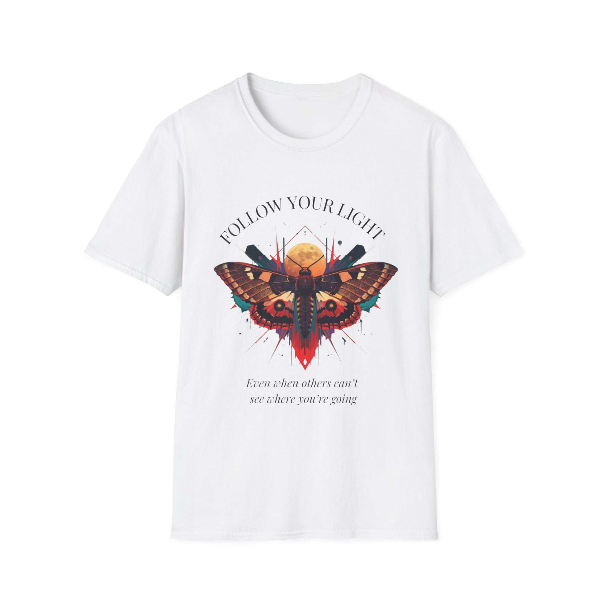 Moth and Moon Graphic T-Shirt — 'Follow Your Light' Inspirational Tee